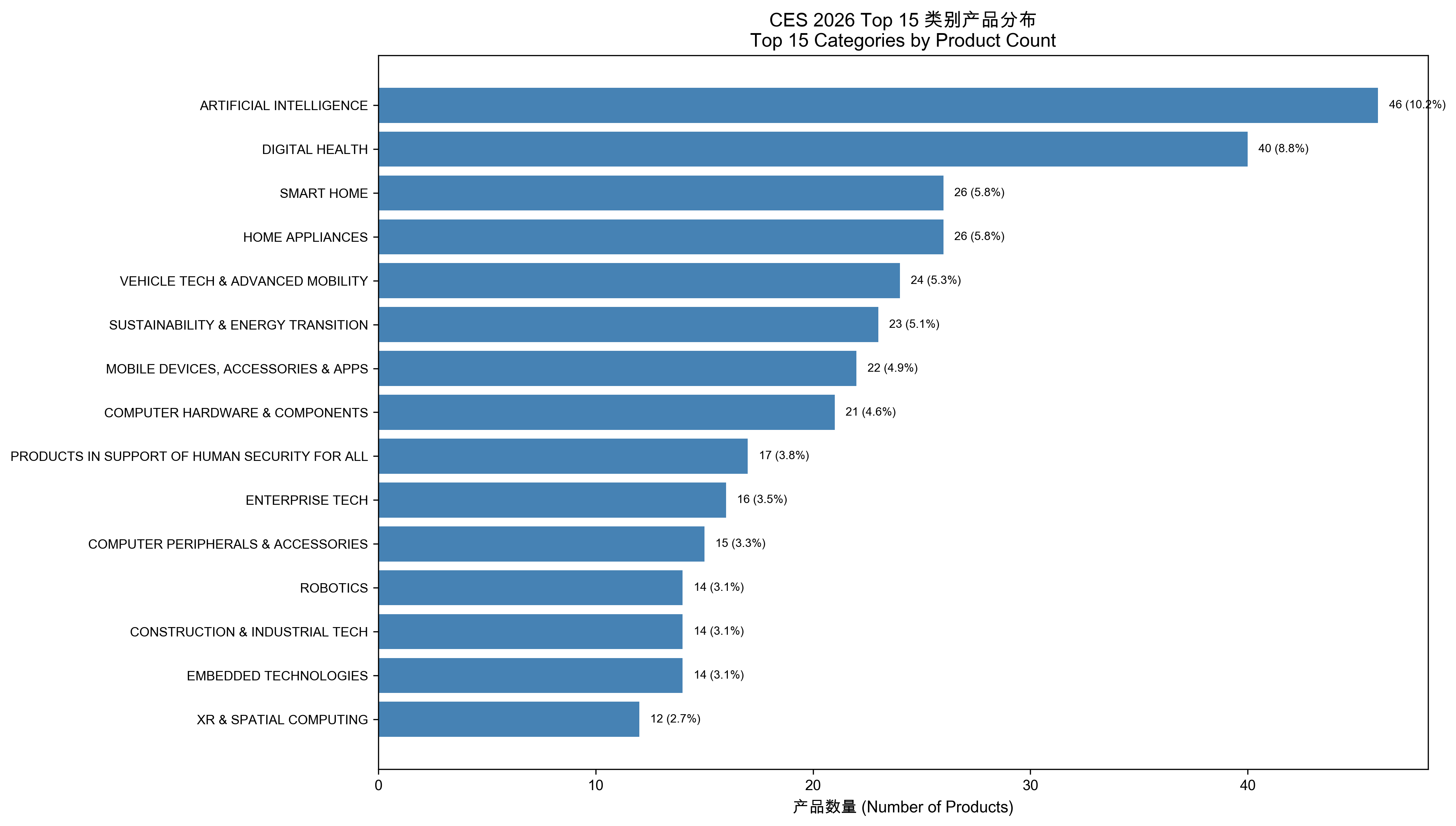 1. AI主导地位: 人工智能以46个产品遥遥领先,占总产品的10.2%,成为绝对主导类别