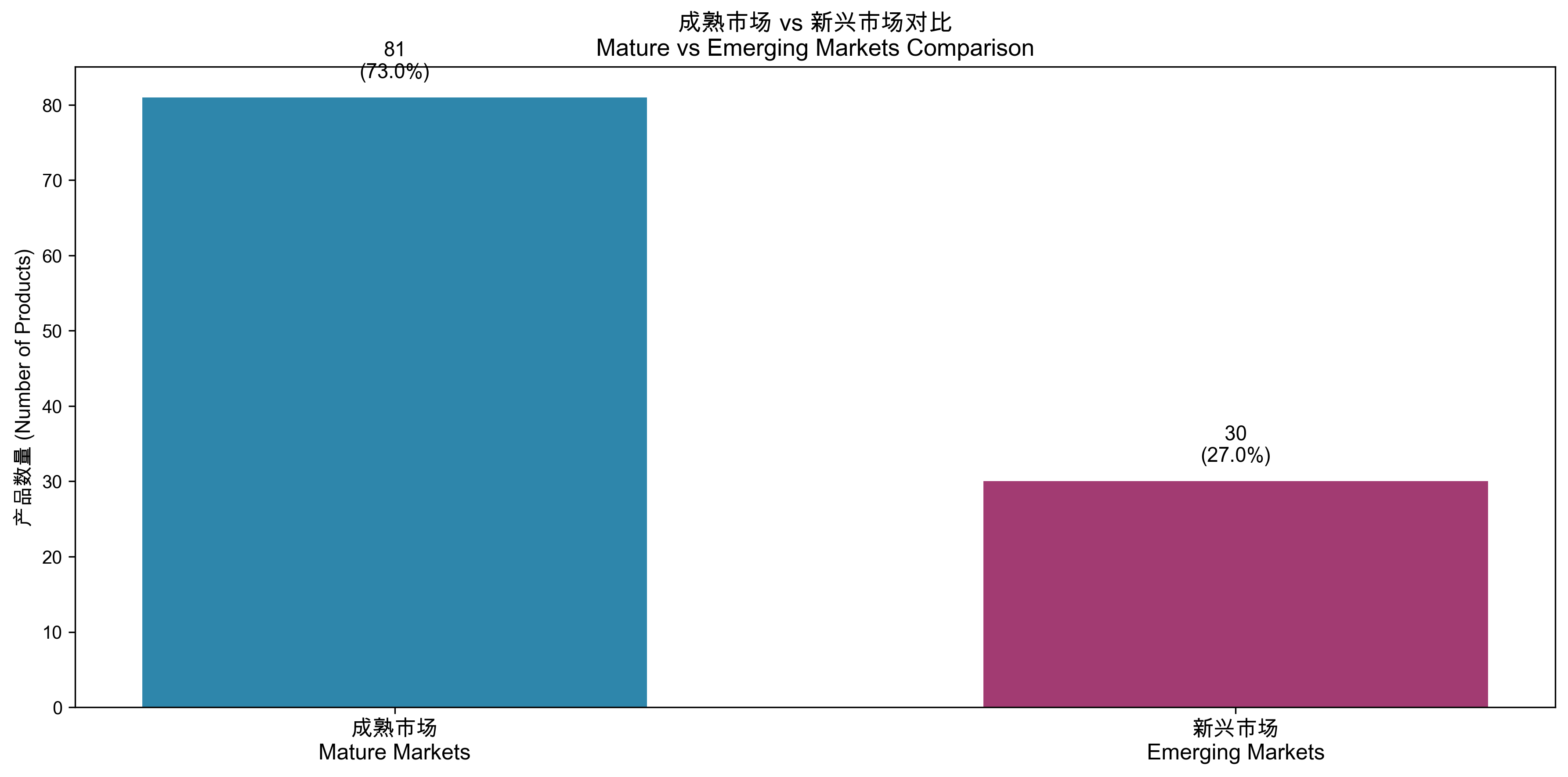 • 市场特征: 成熟市场仍占主导地位,但新兴市场类别多样性更高