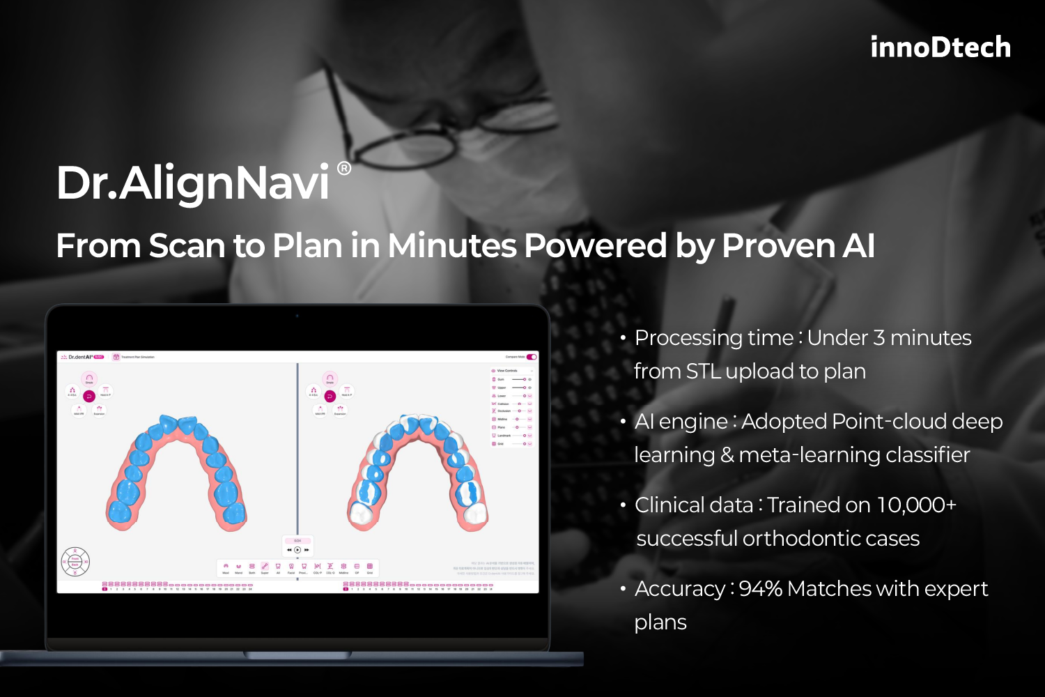 Dr.AlignNavi 解决了正畸学中的一个主要瓶颈:依赖专家直觉的缓慢且不一致的治疗方案制定。传统工作流程需要数小时,且因临床医生而异。Dr.AlignNavi 使用在 10,000 多个案例上训练的深度学习引擎,在 3 分钟内自动生成高精度的矫治器治疗方案。其涵盖诊断、模拟和结果预测的模块化流程,是首个将可解释 AI(XAI)和交互式 3D 可视化结合于一体的平台。临床医生可以获得值得信赖、可编辑的方案及置信度分数,而患者则能更好地了解治疗效果——从而提高治疗接受度和依从性。非专科诊所可以用更少的椅旁时间和更少的修改次数提供专家级的结果,从而降低成本和精力。该系统符合 HIPAA 标准,并按照 ISO 13485/IEC 62304 标准开发,支持大规模实时使用。作为白标 SaaS 提供,Dr.AlignNavi 可集成到全球的牙科平台和矫治器系统中,加速整个正畸生态系统的数字化转型,为 AI 驱动、以患者为中心的牙科树立新标准。