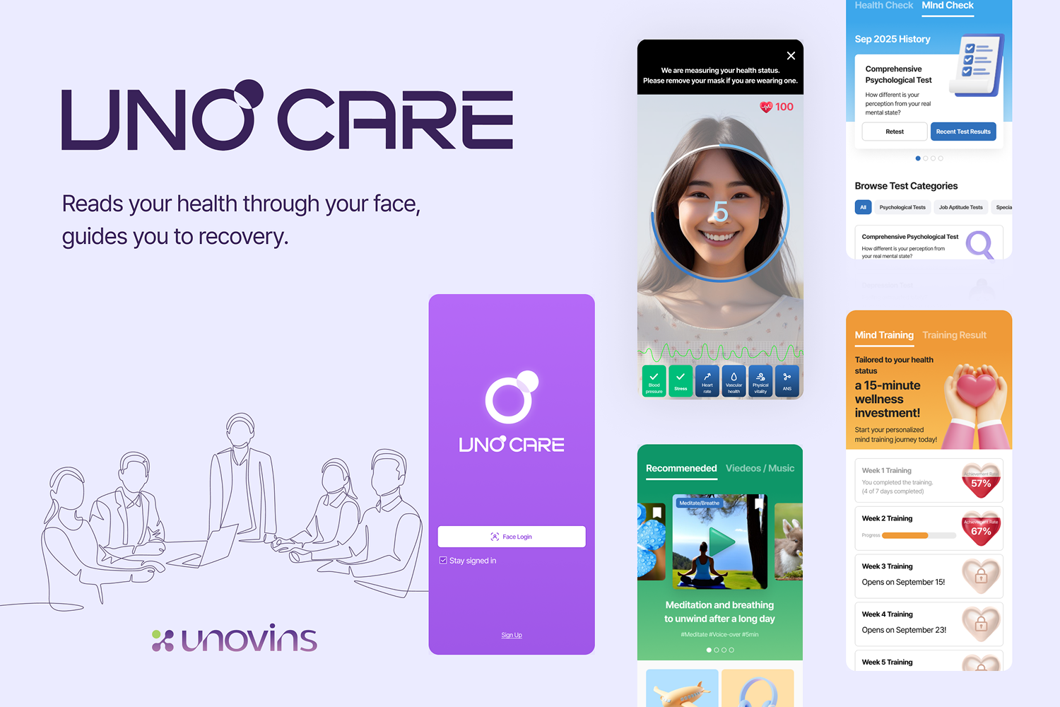 UNO CARE 是一个由 AI 驱动的健康平台,旨在改变移动健康测量方式。与大多数受限于静态条件的基于摄像头的应用程序不同,UNO CARE 利用人脸追踪技术,即使在移动中——如行走、锻炼或日常生活中——也能保持高精度,使压力和活力监测变得无缝且可靠。通过分析面部血流信号,它可以识别压力、倦怠、疲劳和焦虑等关键健康状态,然后通过个性化的恢复路径指导用户。该平台提供了一个完整的一站式健康循环:从测量到洞察,从指导到恢复。用户可以访问一个包含沉浸式疗愈内容的庞大库——包括视觉内容、双耳节拍、引导冥想和自适应训练模块——让他们随时随地恢复平衡。凭借超过 30 项认证的心理评估和一个 AI 心理健康聊天机器人,UNO CARE 将自我护理统一为一种简单、可及的体验。它可扩展到移动设备、一体机、可穿戴设备和远程医疗系统,为整体健康创建了一个互联的生态系统。